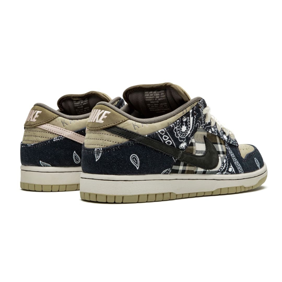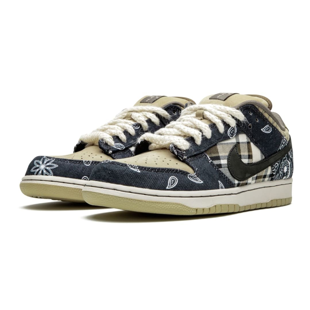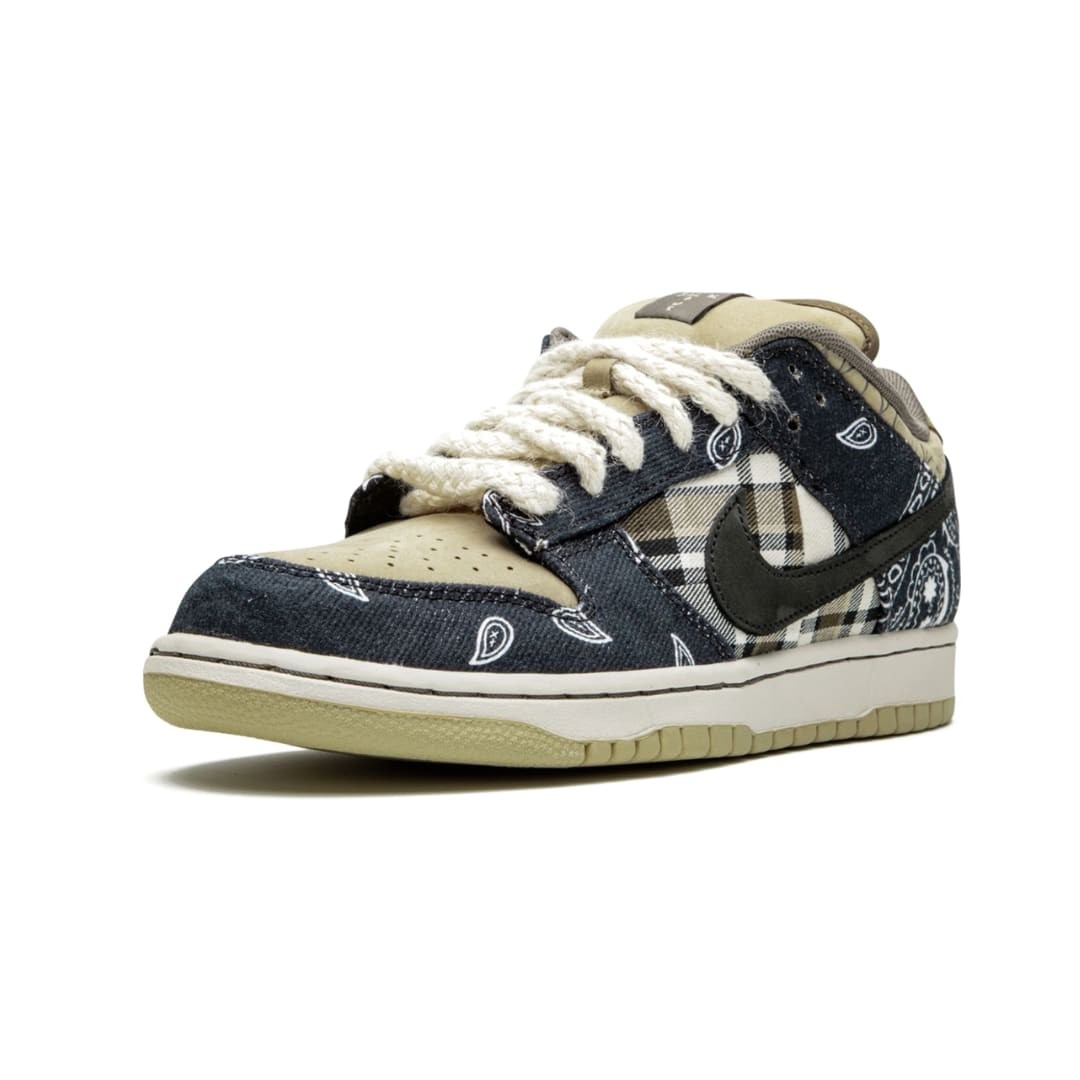 The Travis Scott x Dunk Low SB shows off a unique patchwork motif on the upper, featuring a tan leather base with plaid quarter panels and paisley print overlays, the latter made to tear away to reveal hidden elephant print underneath. The dueling patterns are complemented by rope laces, Cactus Jack tongue tags and mismatched black and pink Swooshes on each shoe. A white midsole and tan rubber outsole anchor the complex design.